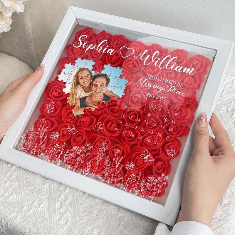 Caixa De Sombra De Flores Com Foto Personalizada E Peça Faltante Com Luz, Presente Para Casal